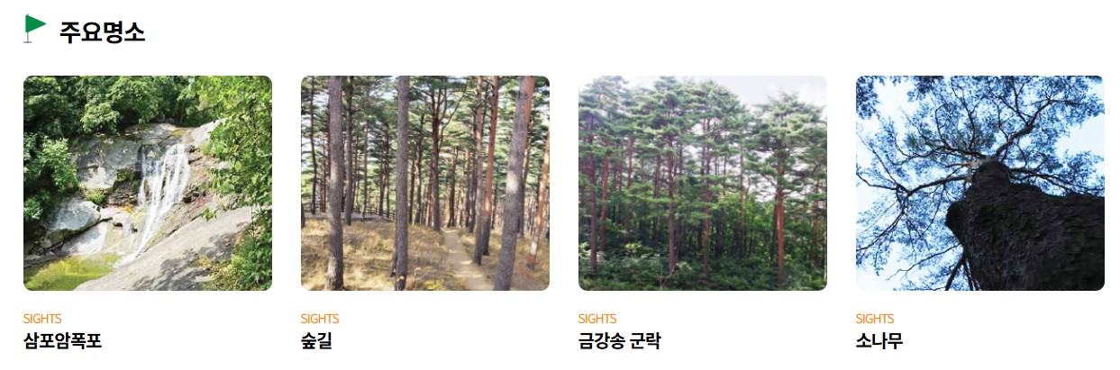 - 특징 : 완만한 능선과 울창한 소나무 숲이 이어집니다. 가벼운 산행 후 이어서 걷기 좋습니다.